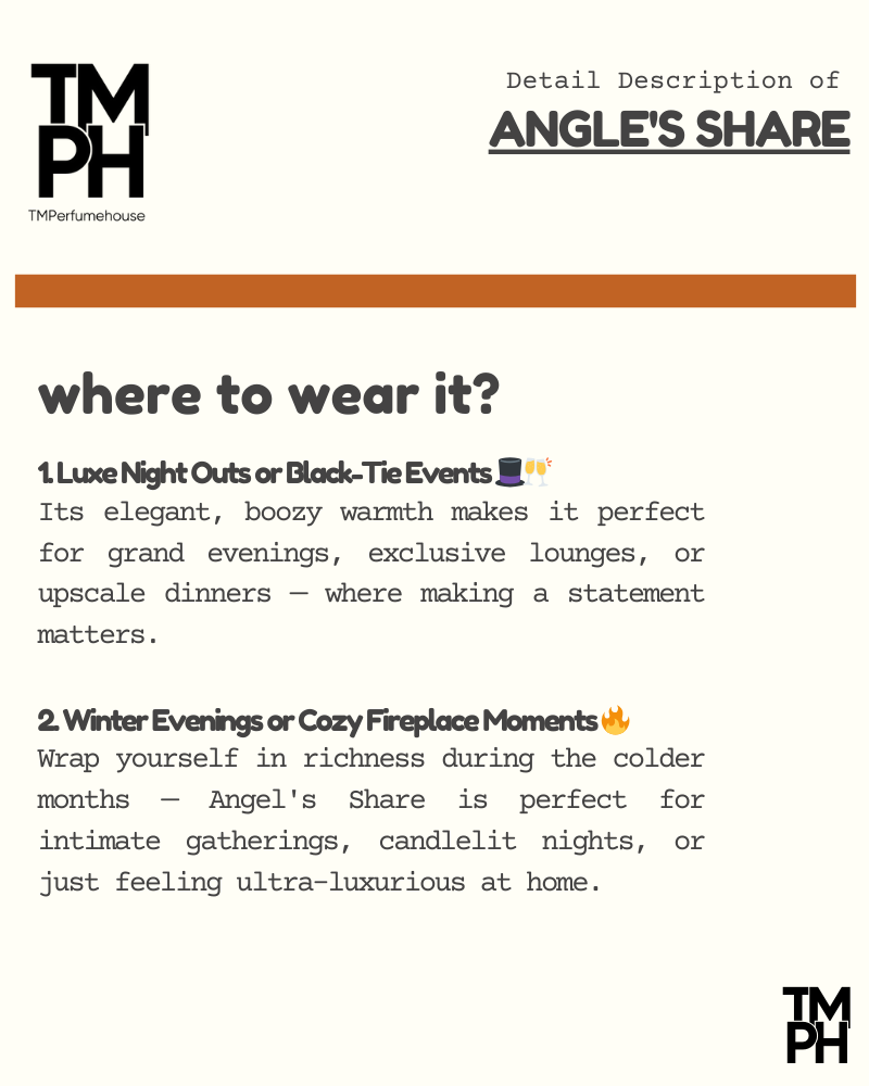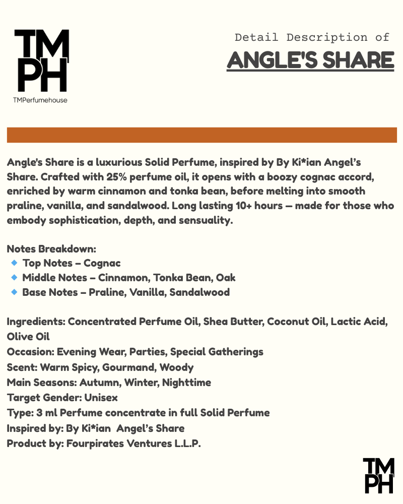 Angle’s Share is a luxurious Solid Perfume, inspired by By Ki*ian Angel’s Share. Crafted with 25% perfume oil, it opens with a boozy cognac accord, enriched by warm cinnamon and tonka bean, before melting into smooth praline, vanilla, and sandalwood. Long lasting 10+ hours — made for those who embody sophistication, depth, and sensuality.