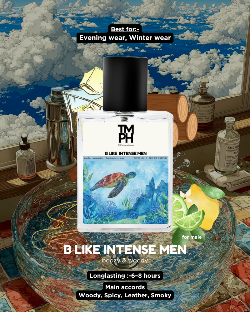 b like intense men is a warm and powerful scent that embodies strength and elegance. It opens with black pepper, bergamot, and bay leaf, evolving into a heart of rum, cinnamon, and clary sage. The base of leather, benzoin, cedarwood, and patchouli delivers depth and intensity, making it refined yet commanding.