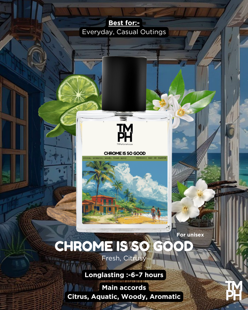 Chrome is so good, offering a sparkling blend of citrus brightness and aquatic freshness, balanced with warm woody undertones. The fragrance evokes freedom, energy, and confidence, making it perfect for daily wear. Its crisp, uplifting character leaves a lasting impression, symbolizing modern masculinity with an invigorating and timeless allure.
