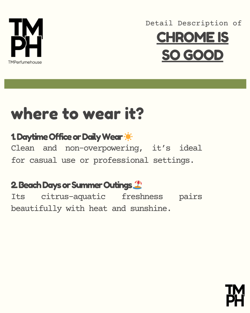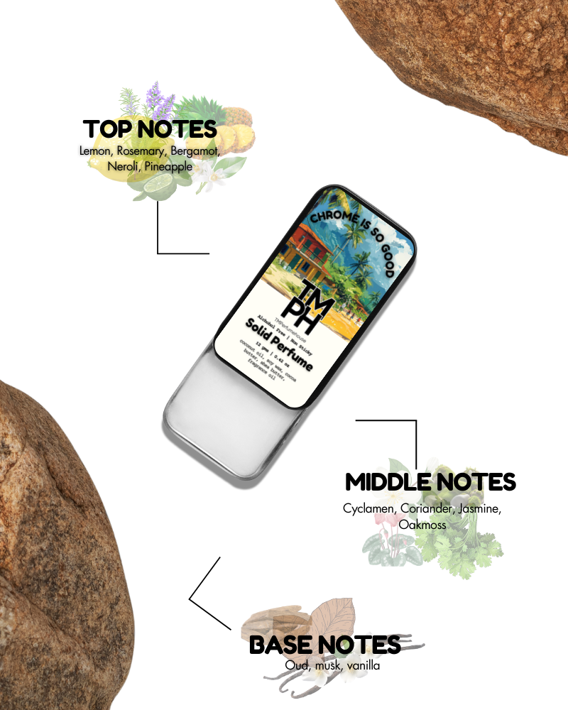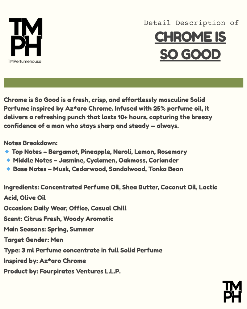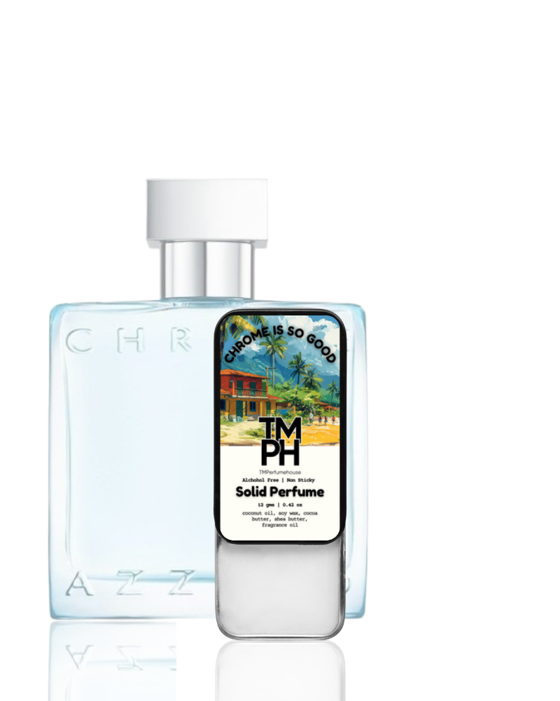 Chrome is So Good is a fresh, crisp, and effortlessly masculine Solid Perfume inspired by Az*aro Chrome. Infused with 25% perfume oil, it delivers a refreshing punch that lasts 10+ hours, capturing the breezy confidence of a man who stays sharp and steady — always.