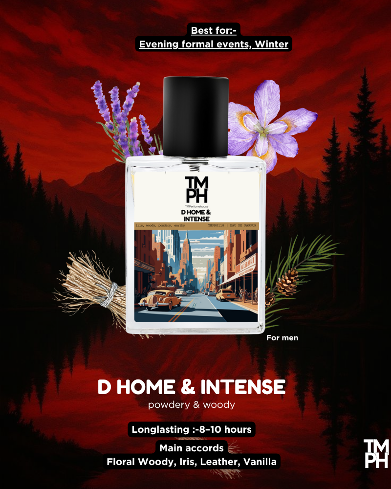 D Home & Intense opens with powdery iris and lavender, unfolding into a warm heart of amber and pear. Anchored by vetiver and cedar, it feels sensual, deep, and sophisticated. Perfect for evening wear, D Home & Intense embodies charm, refinement, and a timeless masculine allure that lingers effortlessly.