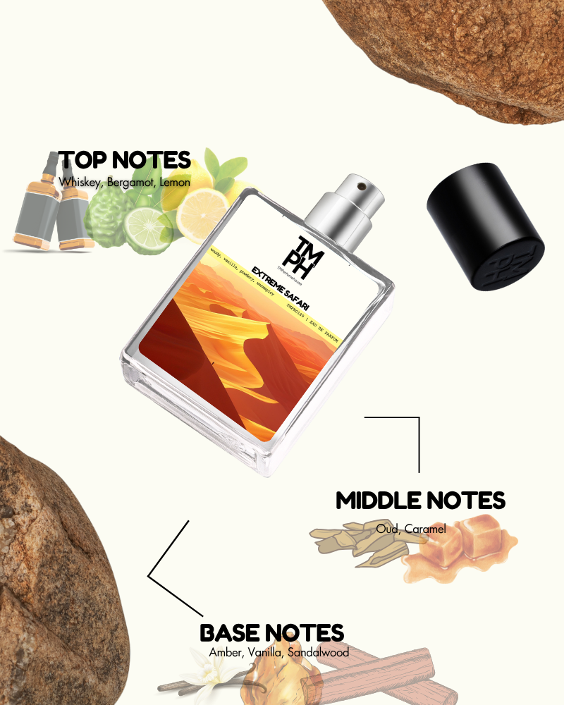 Extreme Safari fuses saffron, cardamom, and cinnamon with leather and woody oud. Rich amber and musk enhance its depth. Adventurous, bold, and luxurious, it’s made for those who love intensity and exploration.