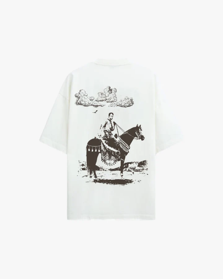 The FLRIDA “Lone Rider” Tee from the Free Your Energy collection captures the spirit of timeless wanderers. Built from 220 GSM premium French Terry cotton with a heavyweight oversized fit, it offers comfort while carrying a bold monochrome back print: a rider on horseback under a vast open sky. Minimal yet evocative, it’s a design that speaks of journeys, solitude, and freedom.