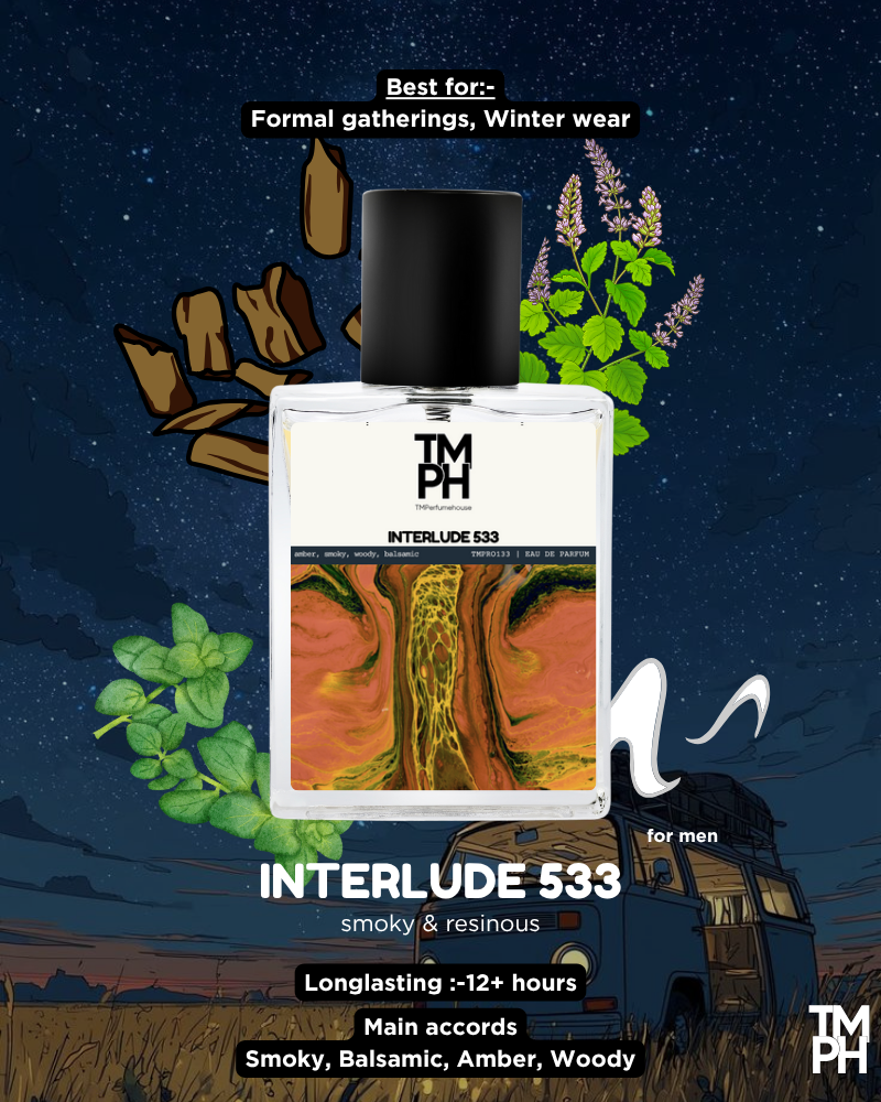 Interlude 533 is an opulent and intense fragrance that embodies sophistication and mystery. Opening with bergamot, oregano, and pimento berry, it evolves into a heart of amber, frankincense, and labdanum, wrapped in warm spices. The base of oud, leather, patchouli, and sandalwood lingers endlessly, offering unrivaled richness and longevity.