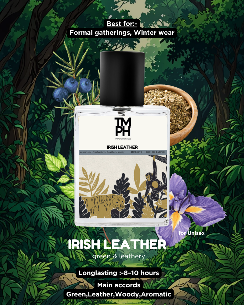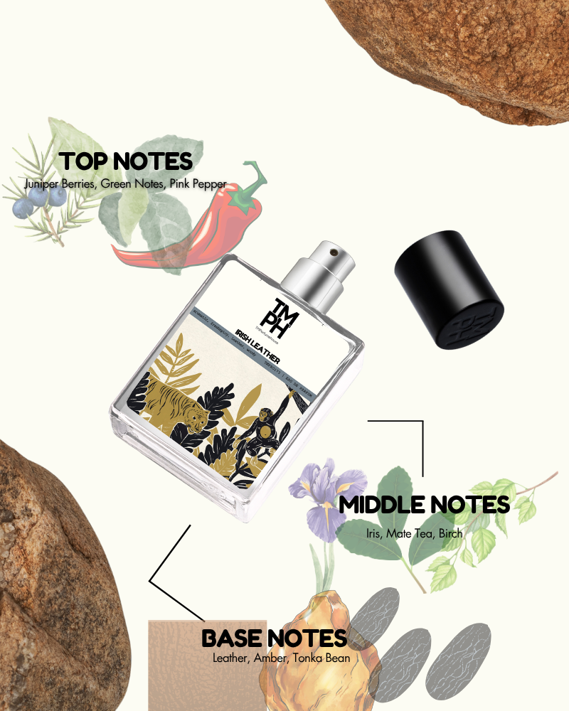 irish leather captures the rugged beauty of the Irish countryside. It opens with juniper berries, pink pepper, and clary sage for aromatic brightness, blending into a heart of mate and iris. The base of birch, tonka bean, and rich leather adds depth, creating a fragrance that is powerful, free-spirited, and enduring.