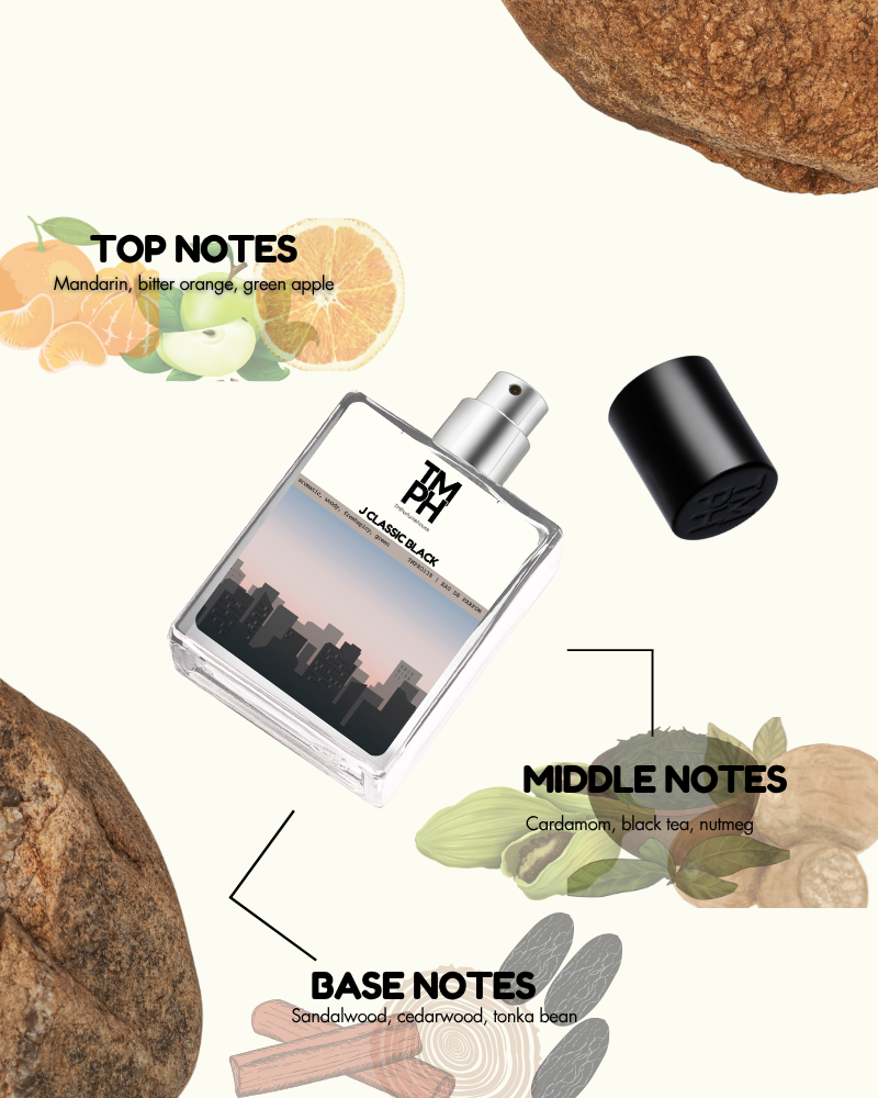 j classic black is a versatile and elegant scent crafted for the confident man. It opens with zesty mandarin, bitter orange, and green apple, flowing into a heart of cardamom, nutmeg, and sea water accord. The base of sandalwood, cedarwood, moss, and tonka bean adds warmth, depth, and timeless sophistication.