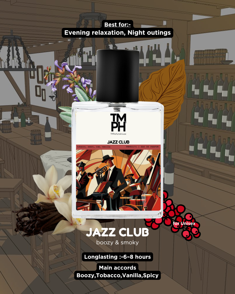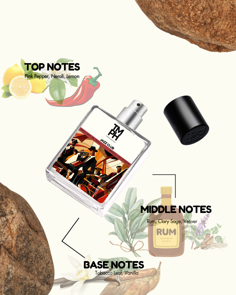 jazz club is a sensual, atmospheric scent inspired by the ambiance of smoky bars and smooth music. It opens with zesty pink pepper, neroli, and lemon, melting into a heart of rum, clary sage, and vetiver. The base of tobacco leaf, vanilla, and styrax creates depth, warmth, and irresistible sophistication.