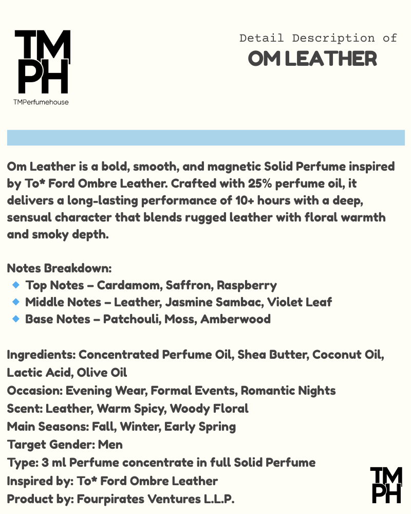 Ombre Nomade is a deep and mysterious Solid Perfume, inspired by L*uis Vuitton Ombre Nomade. With 25% perfume oil, it unveils an intense oud accord enriched with smoky benzoin and raspberry’s subtle sweetness, layered over warm amberwood. Long lasting for 10+ hours — crafted for those who desire luxury, power, and unforgettable presence.
