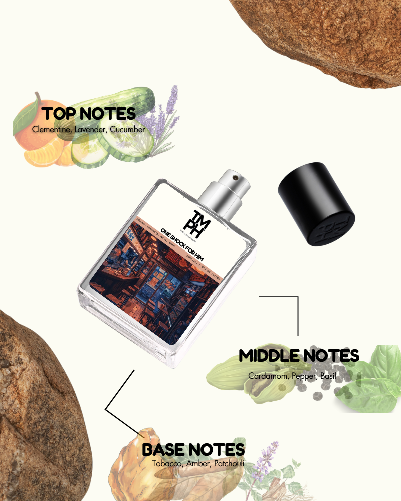 one shock for him is a daring scent designed for the modern man with attitude. It opens with fresh cucumber, lavender, and clementine, leading into a heart of black pepper, basil, and cardamom for spice. The base of tobacco, patchouli, amber, and musk adds warmth, creating a fragrance that is edgy, vibrant, and unforgettable.
