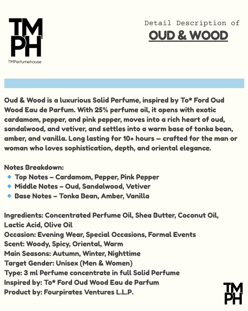 Ombre Nomade is a deep and mysterious Solid Perfume, inspired by L*uis Vuitton Ombre Nomade. With 25% perfume oil, it unveils an intense oud accord enriched with smoky benzoin and raspberry’s subtle sweetness, layered over warm amberwood. Long lasting for 10+ hours — crafted for those who desire luxury, power, and unforgettable presence.