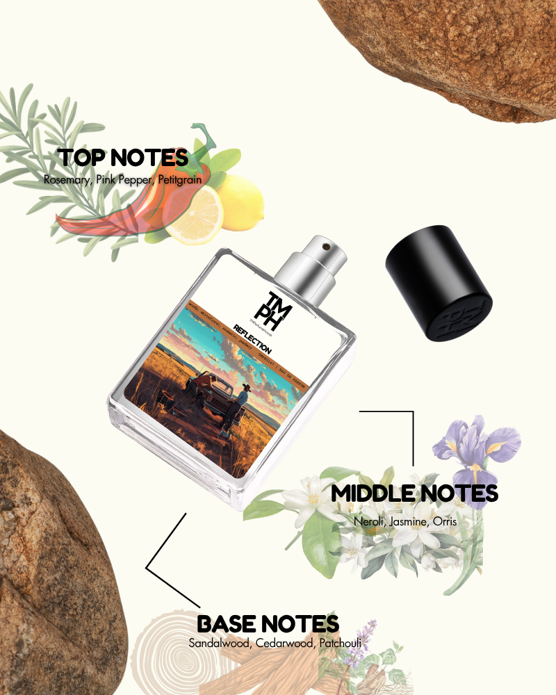 reflection is a sophisticated scent that embodies purity and grace. It opens with fresh rosemary, red pepper berries, and bitter orange leaves, leading into a radiant heart of neroli, jasmine, and orris. The base of cedarwood, sandalwood, and vetiver adds warmth and depth, creating a fragrance that is serene, elegant, and enduring.
