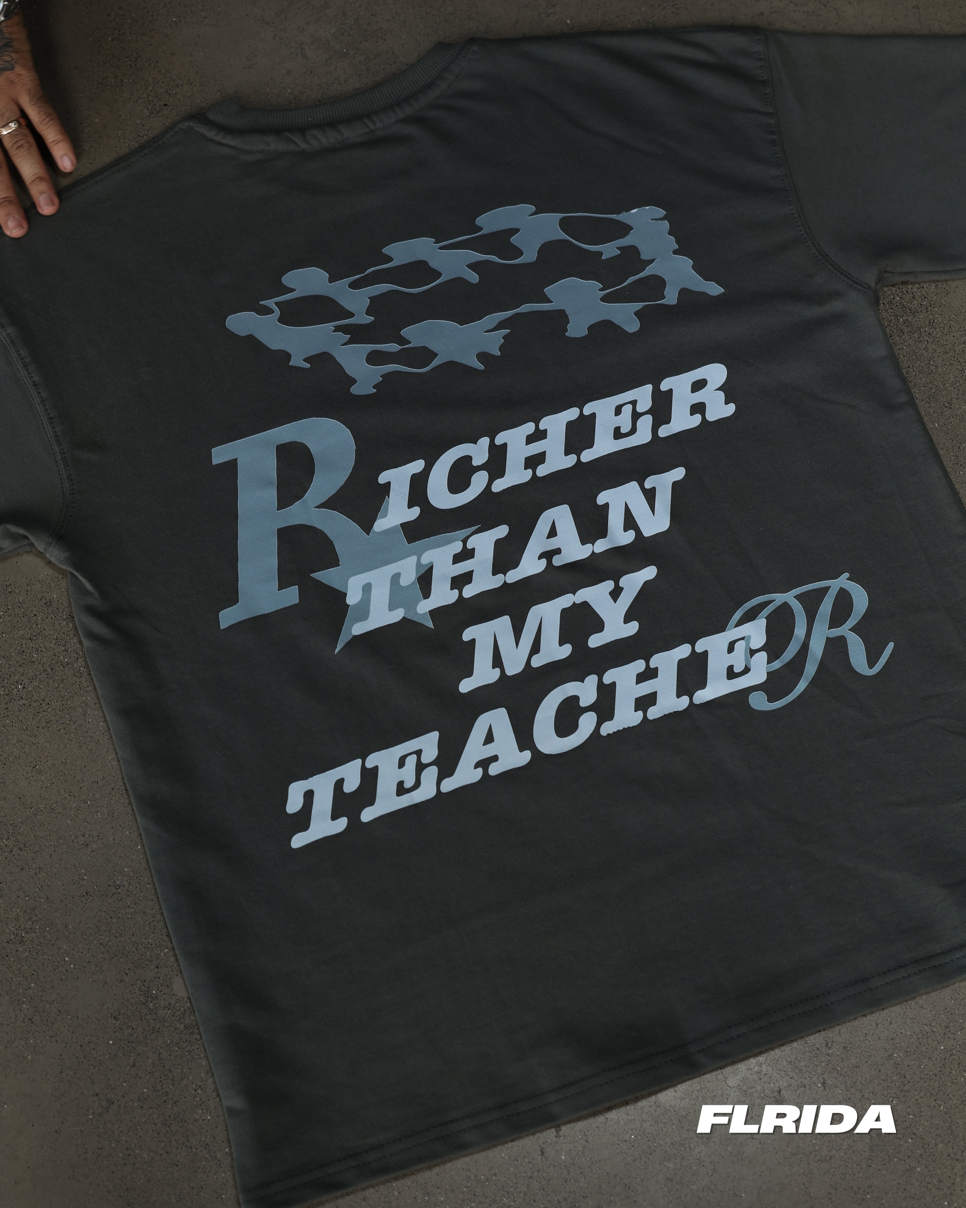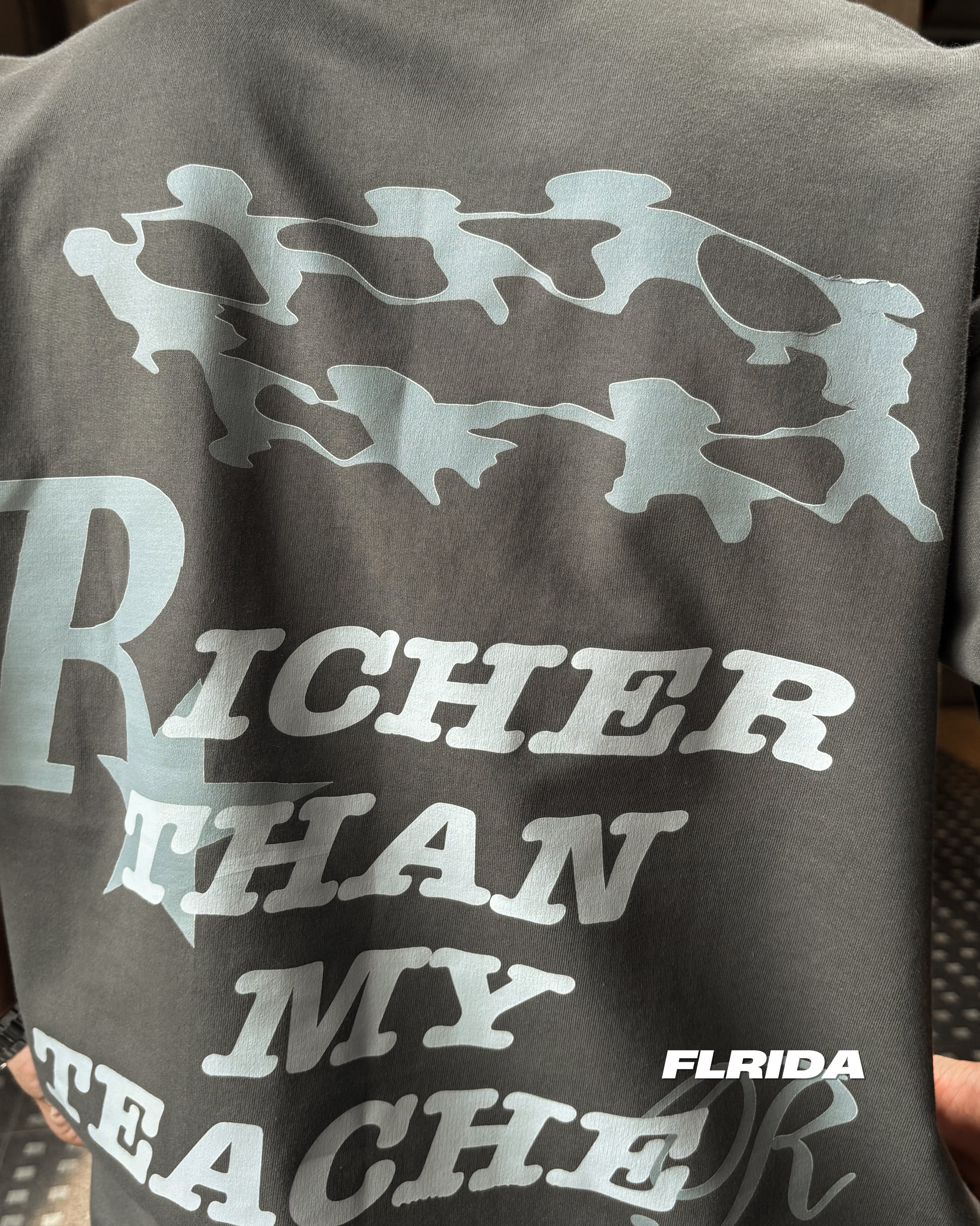 Rule-breaker energy meets retro flair. The FLRIDA ‘Richer Than My Teacher’ Tee is a statement piece designed for those who don’t play by the rules — they rewrite them. Made with 220 GSM premium French Terry cotton, this oversized fit brings heavyweight comfort with a luxe streetwear edge. The front keeps it clean with a distorted FLRIDA logo, while the back steals the spotlight with a bold graphic print that speaks to ambition louder than words.