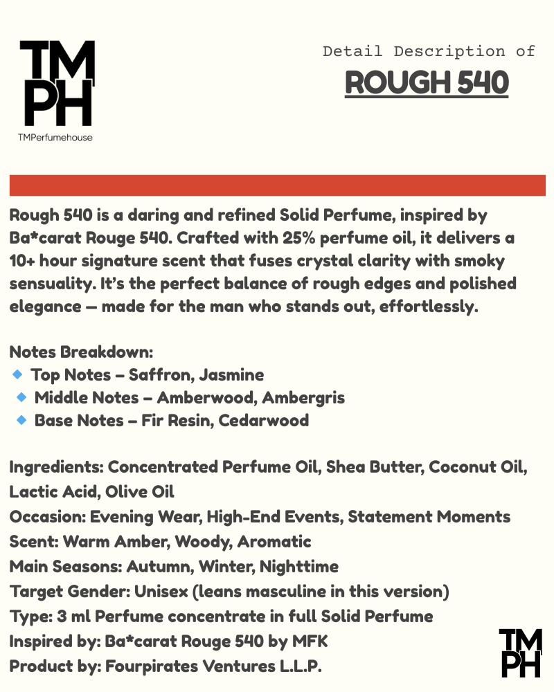 Rough 540 is a daring and refined Solid Perfume, inspired by Ba*carat Rouge 540. Crafted with 25% perfume oil, it delivers a 10+ hour signature scent that fuses crystal clarity with smoky sensuality. It’s the perfect balance of rough edges and polished elegance — made for the man who stands out, effortlessly.