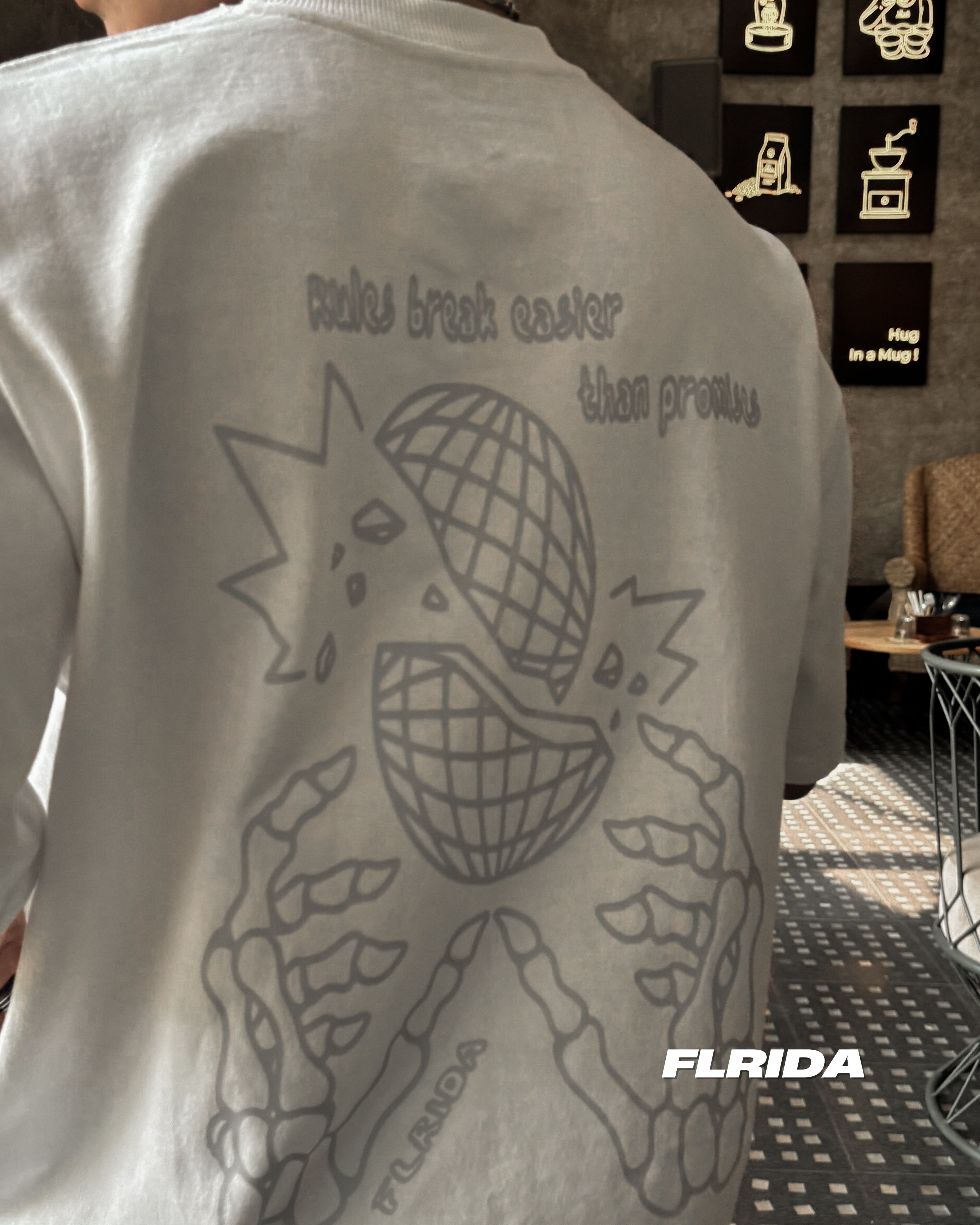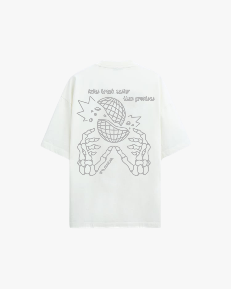 The FLRIDA “Rulebreaker” Tee from the Free Your Energy collection is built for those who refuse to follow the script. Made from 220 GSM premium French Terry cotton in a heavyweight oversized cut, it’s all about comfort with an edge. The back graphic features skeletal hands shattering a globe, framed with the line: “Rules break easier than promises.” A bold statement in a clean design.