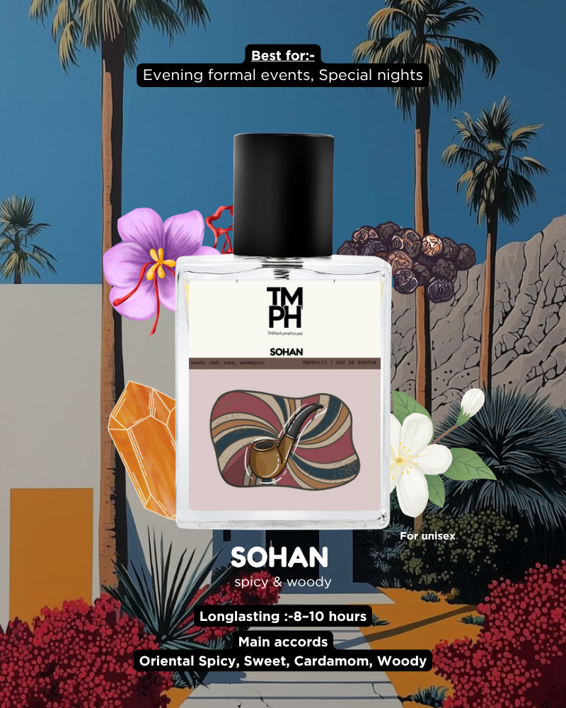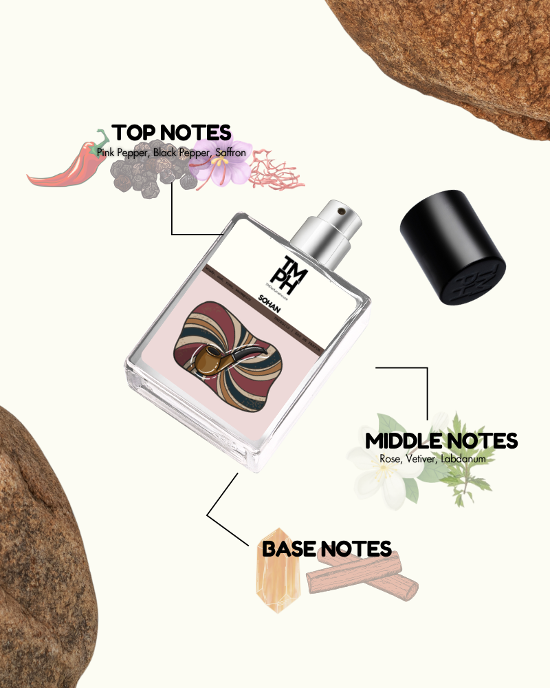 Sohan opens with the spicy warmth of saffron and pink pepper, unfolding into a heart of velvety rose. Anchored by smoky oud and vetiver, it creates a fragrance that is daring yet refined. Complex and opulent, Sohan embodies confidence, intrigue, and the timeless elegance of oriental artistry.