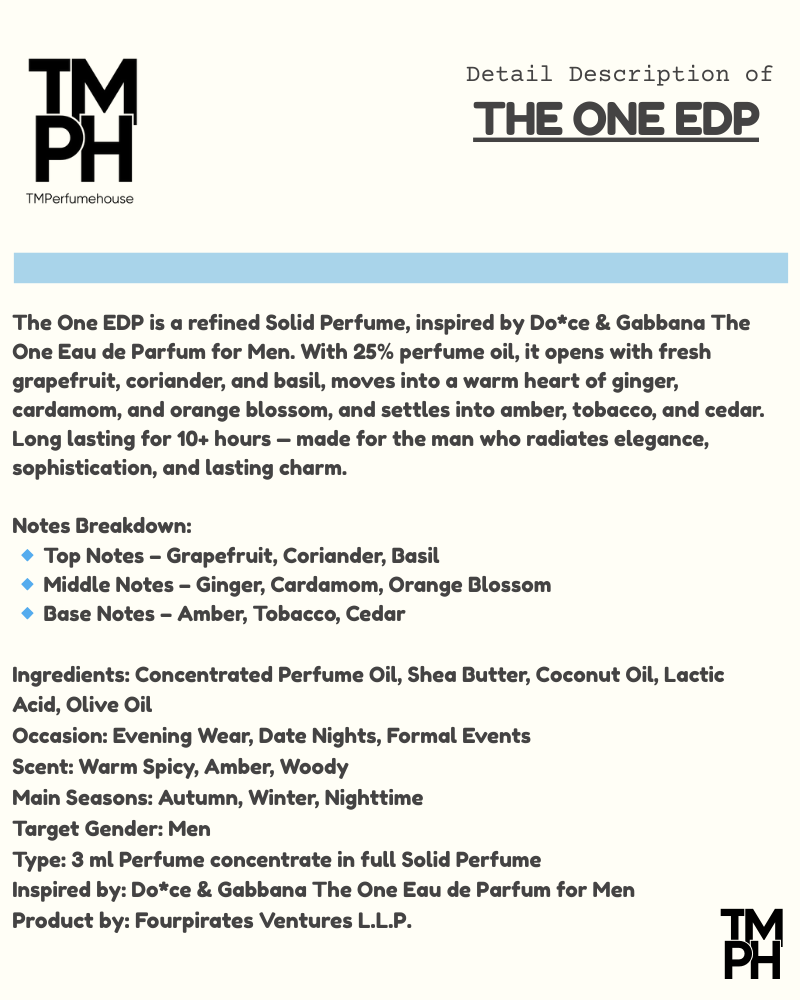 The One EDP is a refined Solid Perfume, inspired by Do*ce & Gabbana The One Eau de Parfum for Men. With 25% perfume oil, it opens with fresh grapefruit, coriander, and basil, moves into a warm heart of ginger, cardamom, and orange blossom, and settles into amber, tobacco, and cedar. Long lasting for 10+ hours — made for the man who radiates elegance, sophistication, and lasting charm.