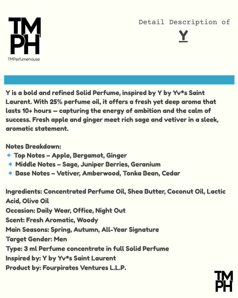 Y is a bold and refined Solid Perfume, inspired by Y by Yv*s Saint Laurent. With 25% perfume oil, it offers a fresh yet deep aroma that lasts 10+ hours — capturing the energy of ambition and the calm of success. Fresh apple and ginger meet rich sage and vetiver in a sleek, aromatic statement.